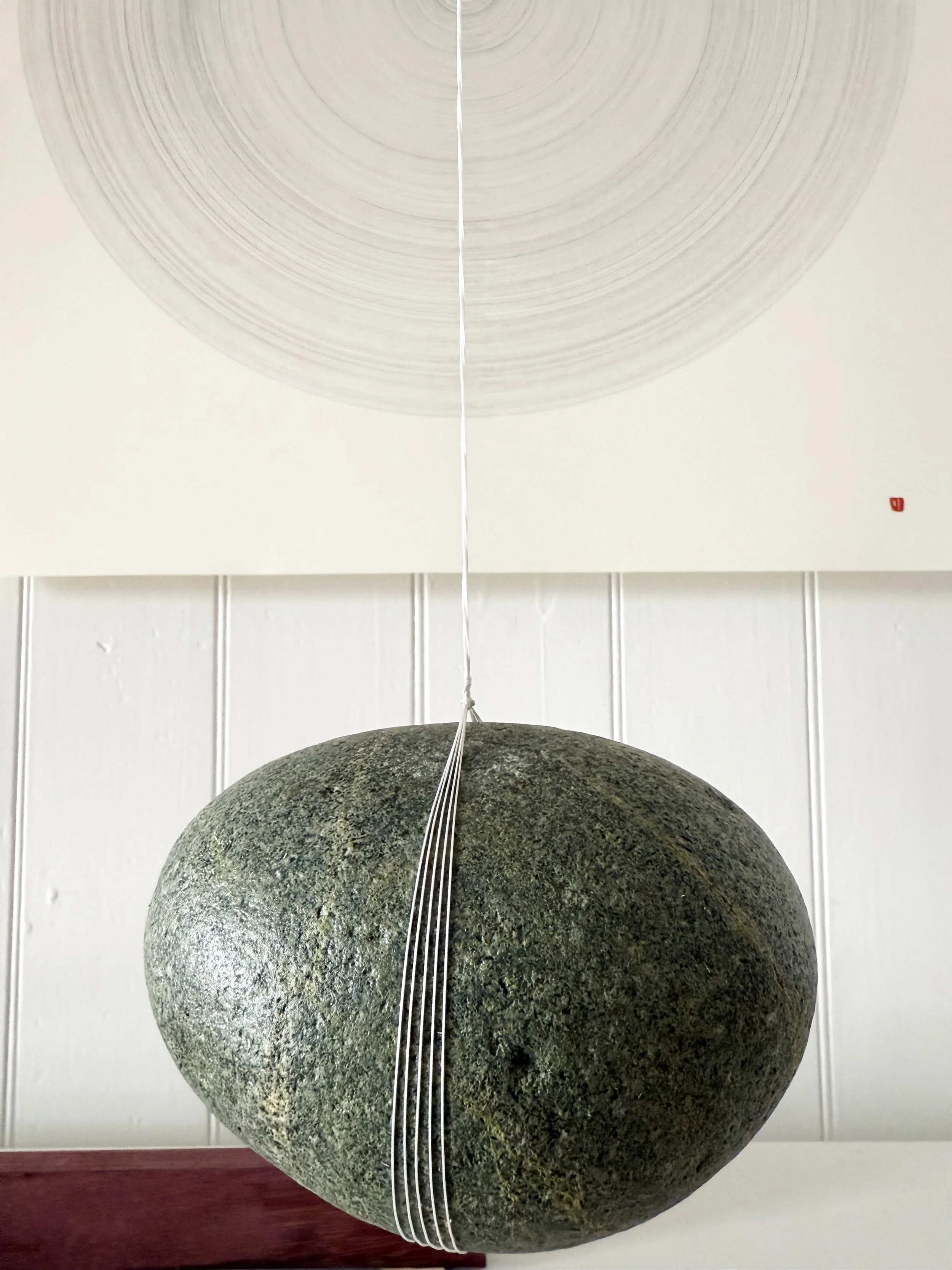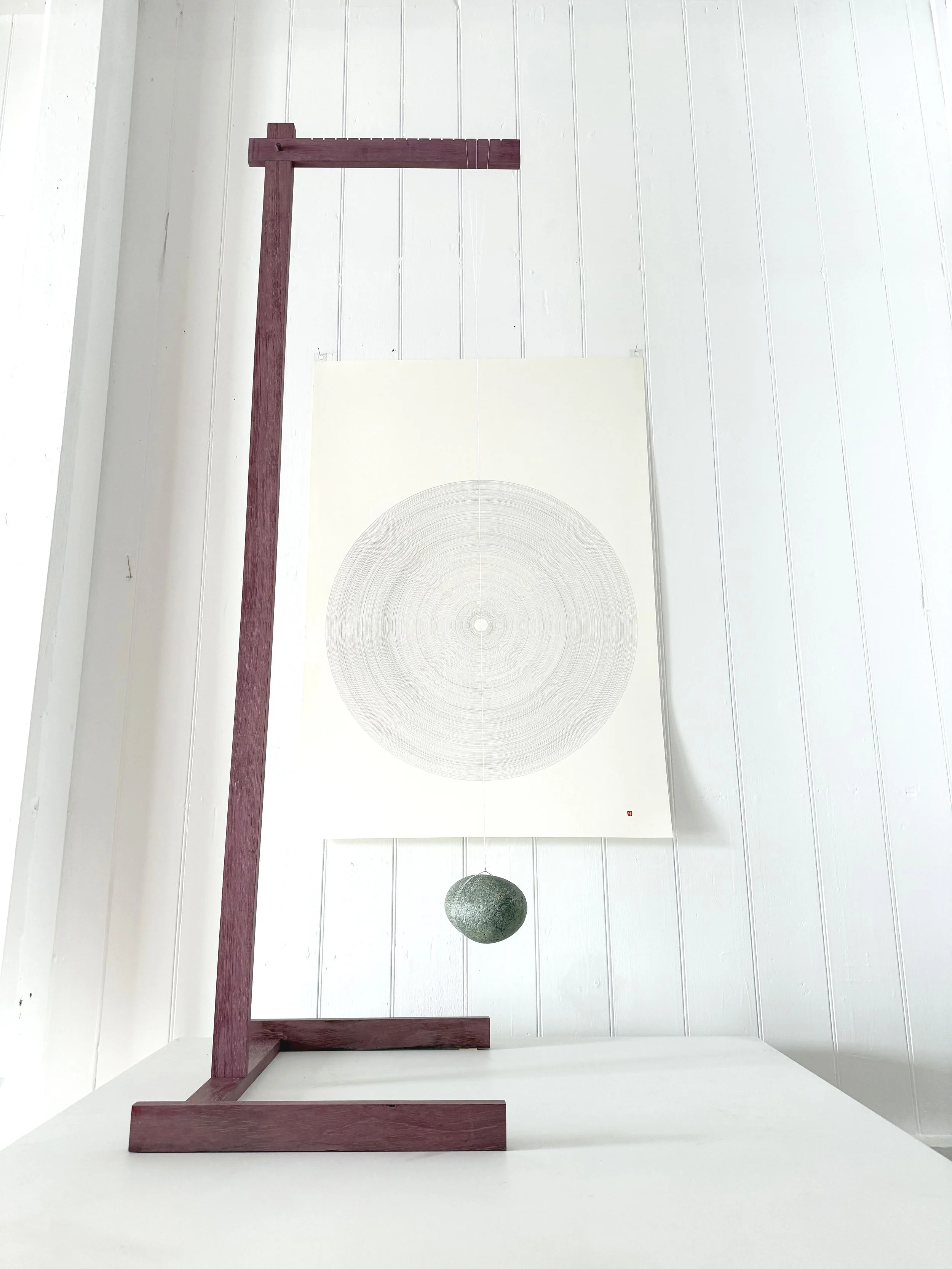 timber, stone, thread, graphite on paper
