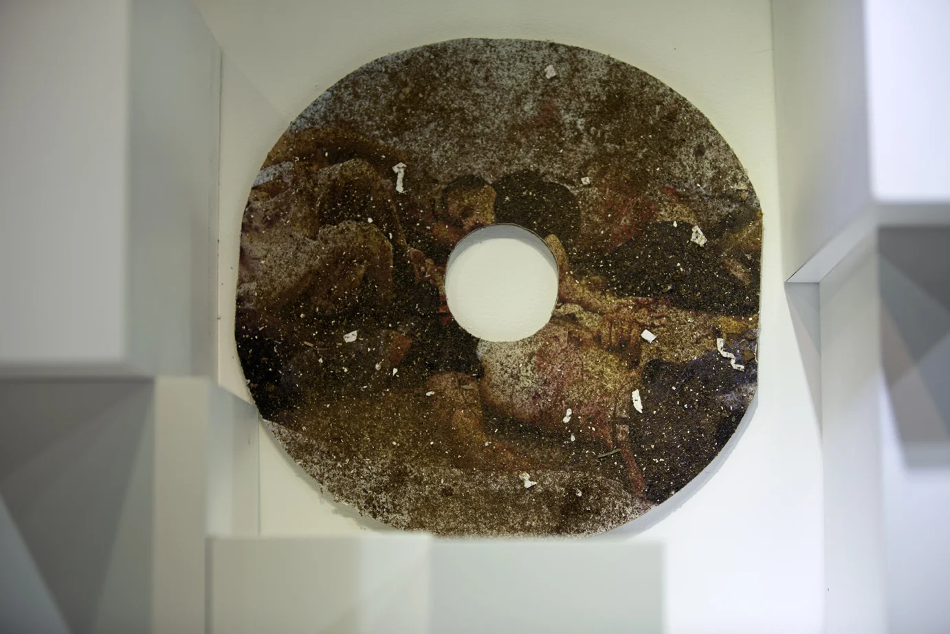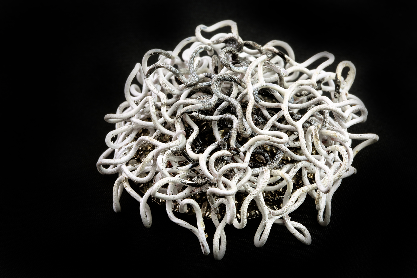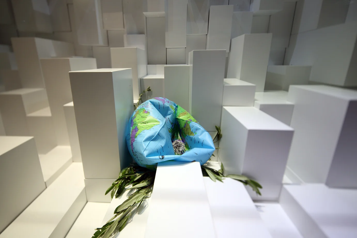 Brooch on beach-ball and olive branches: copper, sterling silver, enamel paints, found costume jewellery, white boxes (created by Robyn George).
