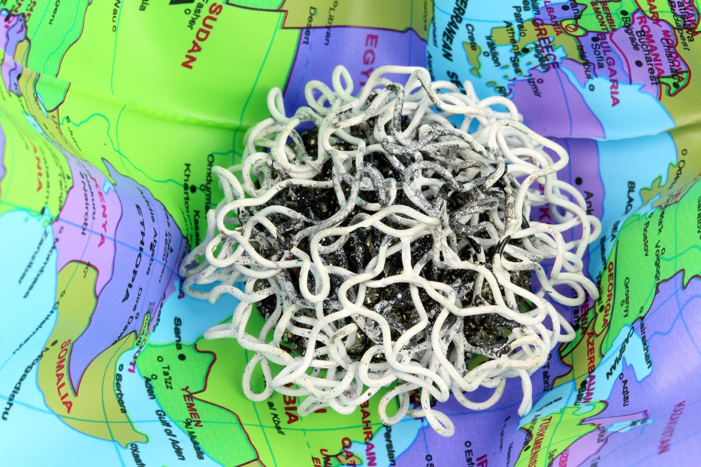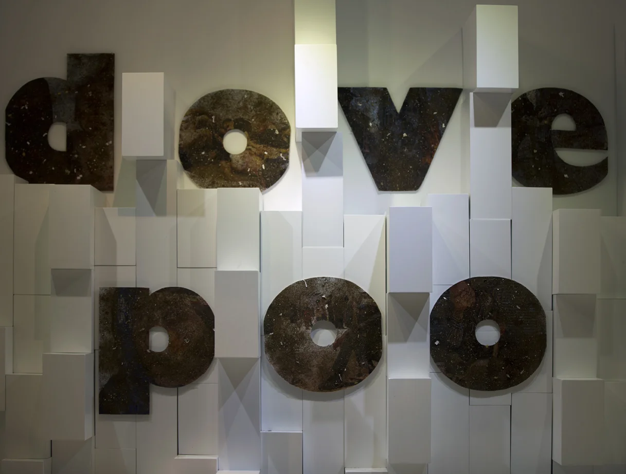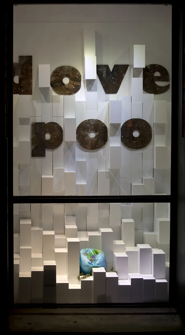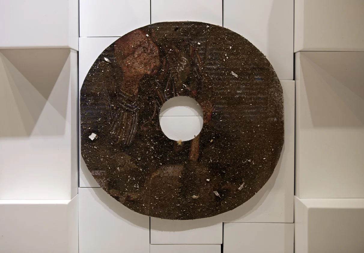 Brooch on beach-ball and olive branches: copper, sterling silver, enamel paints, found costume jewellery, white boxes (created by Robyn George).
